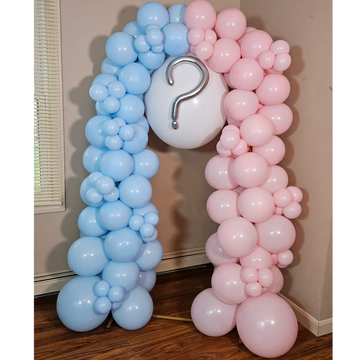 6ft tall mini arch( in your choice of balloon color) with jumbo question mark popper. When popped topper reveals pink or blue balloons and confetti. Includes stand rental and popping wand.